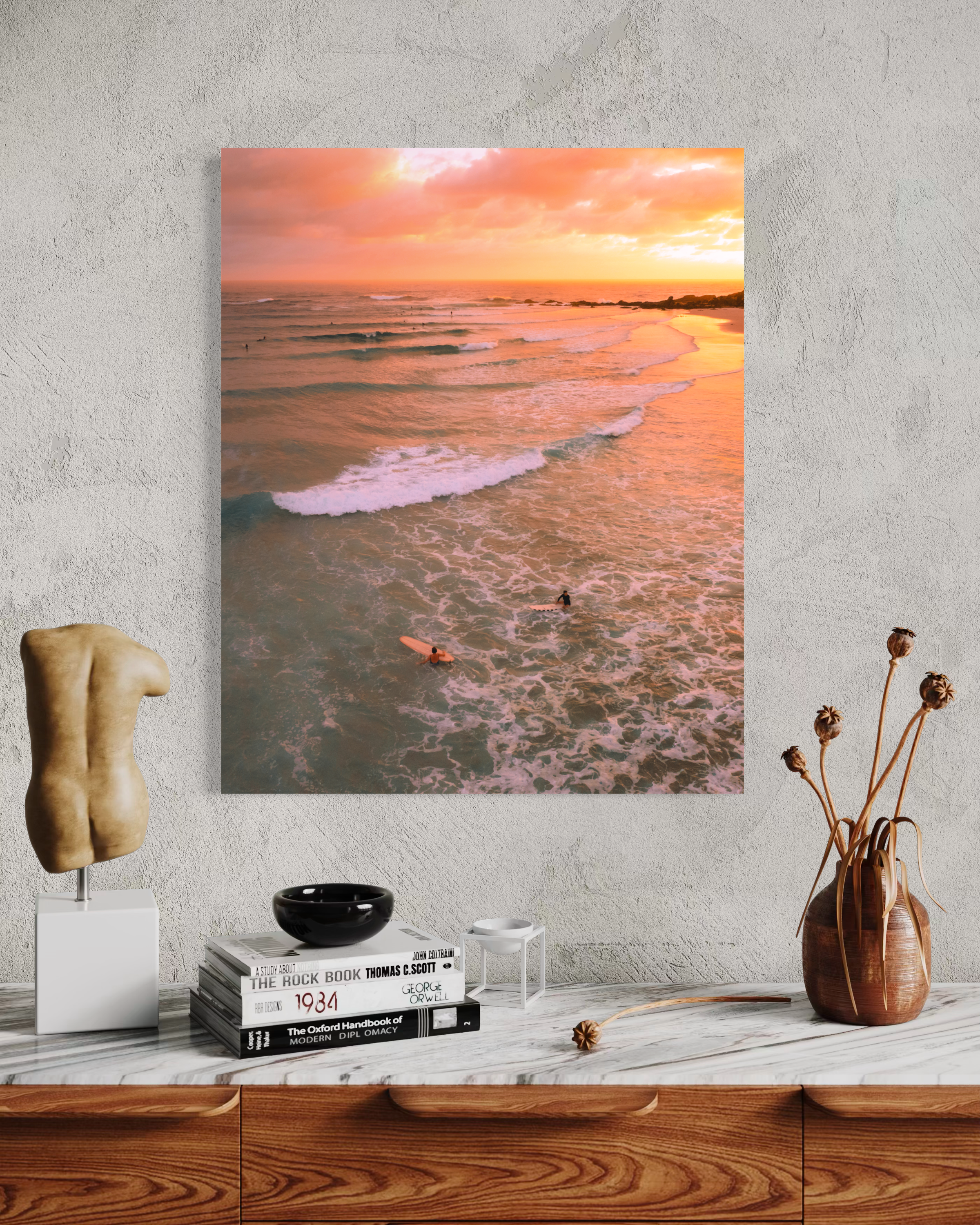 This fine art print captures the blissful stillness of an early morning surf session at one of Australia's most iconic beaches. Perfect for sunrise lovers and those seeking warm, atmospheric coastal wall art.