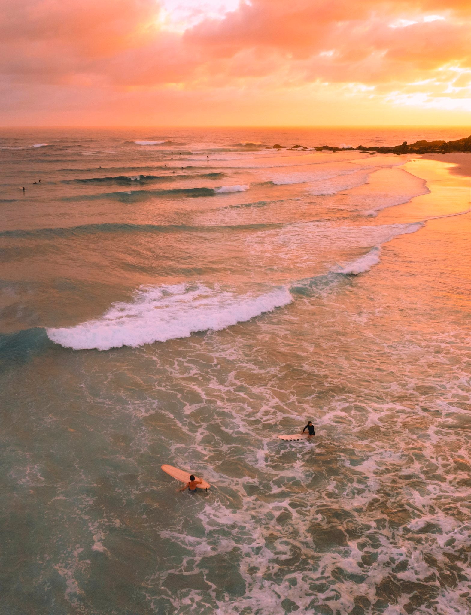 As the first light of dawn breaks over Wategos Beach, this aerial photograph bathes the entire Byron Bay coastline in warm golden and orange hues. Surfers dot the gently breaking waves below, including one perched on a vivid orange surfboard, while the sun rises through soft, textured clouds on the horizon.
